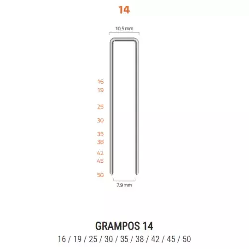 Especificações do Grampo: - Linha: 14 - Coroa: 10,5 mm - Altura: 40 mm - Quantidade: 15.810 unidades por caixa